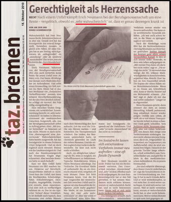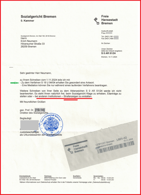 So hat es die Direktorin am Sozialgericht (SG) Bremen Frau [8-19] mit Zeitungsbericht (29.02.2016) in der Öffentlichkeit publiziert. Jedoch in meinem außergewöhnlichen Fall hat die Direktorin im Schreiben vom 29.12.2010 wörtlich dokumentiert: