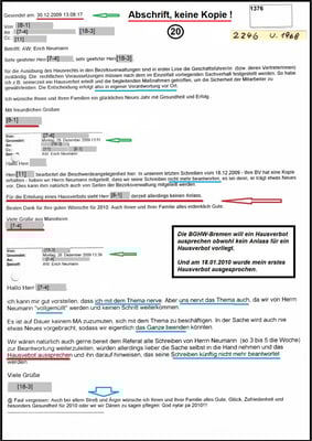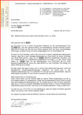 Ich habe niemals ein berechtigtes Hausverbot in der BG Ambulanz erhalten und habe den Antrag gestellt, dass die Mediziner der BG Ambulanz die Regie der Aufklärung in meiner Behördenakte übernehmen. Wie es Dr. [11-2] vor 20 Jahren mit Schreiben vom 12.01.2004 gewünscht hat, damit ich weiter zur Behandlung erscheinen darf und nicht als eine Person behandelt werde die Hausverbote erhalten hat. Die für mich nachteiligen Schriftstücke müssen endlich von der aktenführenden BGHW aus meiner Akte entfernt werden. Dazu liegt ein Bescheid der Generalstaatsanwalt Bremen vom 17.11.2009 vor (140 Js 48585/09). Mehr lesen