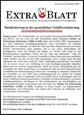 habe ich nur von meiner Meinungsfreiheit gebrauch gemacht. Und meine Überzeugung, dass sich die BGHW Bremen in meinem Fall wie eine kriminelle Vereinigung verhält. Dazu im Einklang habe ich Akten, Verwaltungsentscheidungen und interne Schriftstücke (05.10.2009) der BGHW Bremen aus meiner Beschwerdeangelegenheit (Az.: E 207/09 und E 29/11) für die Öffentlichkeit und Presse zugänglich gemacht.