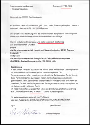 Eine vermeintlich "kriminelle Vereinigung" in unserem Sozialsystem, hat sich am 02.09.2014 bei der Strafanzeige gegen meine Person mit dem Tatvorwurf üble Nachrede und Verleumdung selbst personifiziert. Nachdem ich am 08.02.20015 meine schriftliche Aussage gemacht habe, hat die StA Bremen die Ermittlungen gegen meine Person mit dem Schreiben vom 20.05.2015 sofort eingestellt. Obwohl schon im Jahre 2012 die Kriminalpolizei Bremen erkannt hat, dass ich gegen eine "kriminelle Vereinigung" antrete, will die StA Bremen keine weiteren Ermittlungen aufnehmen, wie die Schreiben aus der StA Bremen vom 19.11.2013 & 17.05.2023 dokumentieren.