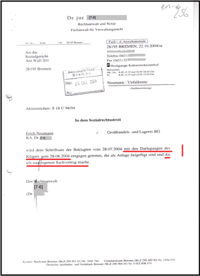 Mein Prozessbevollmächtigter ist kein "Verbrecherjäger" sondern Anwalt für Sozialrecht. Mit dem Hinweis auf den Schriftsatz (16.06.2008) meines damaligen Prozessbevollmächtigten Dr. jur. [7-6], werde ich meinem jetzigen Prozessbevollmächtigten bitten, dass auch er meine Fragen bei Gericht zu eigen macht.