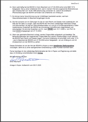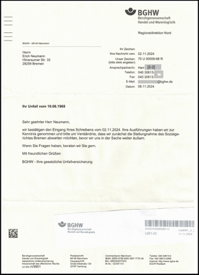 Es ist jetzt schon im Bescheid der BGHW vom 02.11.2023 und Widerspruchsbescheid vom 07.02.2024 dokumentiert, dass die BGHW nur meinen Arbeitsunfall vom 19.06.1968 bei den Ermittlungen berücksichtigt hat. Die BGHW will m. M. keine vollständige Aufklärung betreiben und hofft wohl auf mein Lebensende. Dieses wird aber noch länger dauern, denn mein Arzt hat mir versichert, ich könnte 100 Jahre alt werden. So kann ich noch weiter für die Beteiligten nervende Merkwürdigkeiten aufdecken, bis ich mein Recht erhalten habe.