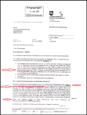 Mit meiner zuständigen Berufsgenossenschaft Handel und Warenlogistik (BGHW) Bremen (vormals GroLa BG) liege ich seit meinem Verschlimmerungsantrag (14.12.2001) im Streit um sachgerechte Unfallrenten aus meinem Arbeitsunfall vom 19.06.1968 und 20.03.2001. Das Sozialgericht (SG) Bremen glaubte nicht mir sondern der Beklagten (BGHW). Erstmalig - nach vielen Klageverfahren - hat das Landessozialgericht (LSG) Bremen nach dem Erörterungstermin am 19.07.2023 in der nichtöffentlichen Sitzung und in dem Vergleichsvorschlag vom 11.09.2023 dokumentiert: