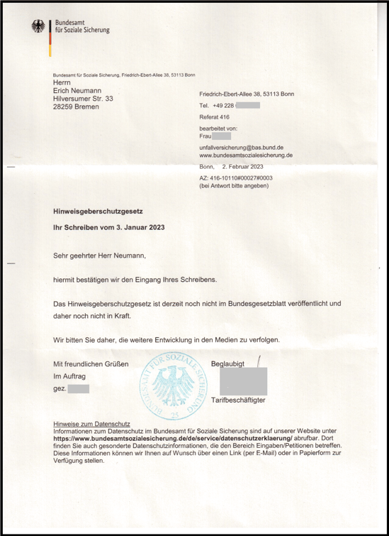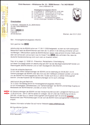 Bei dieser Sachlage können die Behördenmitarbeiter keine Fürsorgepflicht von ihrem Dienstherren erwarten. Denn ihr Dienstherr wird wahrscheinlich von dem Aussageverweigerungsrecht nach der Strafprozessordnung (StPO) § 136 Erste Vernehmung, gebrauch machen. Damit wird natürlich die Bedrohungslage durch die Geschäftsführung der BGHW in Bremen aufrecht erhalten.