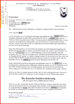 Mitarbeiter der BG ETEM hat am 29.08.2003 für die BGHW (vormals GroLa BG) und für den damals laufenden Gerichtsprozess (Az.: S 18 U 94/04) falsches Beweismittel angefertigt und behauptet es sei das Ergebnis aus einem Begutachtungsauftrag der BGHW, tatsächlich gab es aber keinen Auftrag (Prozessdelikt).
