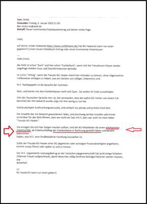 Dazu im Einklang hat die Kriminalpolizei Bremen die interne Stellungnahme der BGHW Bremen vom 05.10.2009 gesichtet und kam zu der Wertung, ich würde gegen eine "kriminelle Vereinigung" antreten und niemals zurückrudern wird und vom Gesetzgeber mit einer Freiheitsstrafe bedroht wird. Diese Wertung habe ich übernommen und ist keine üble Nachrede und keine Verleumdung.