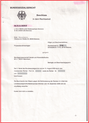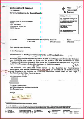 Schreiben von meinem Anwalt Dr. jur. dokumentiert, wir überprüften die Behörden u. Gerichtsakte und haben Prozessdelikt erkannt. Und ist mit dem Schreiben aus dem SG Bremen vom 01.09.2009 und 07.09.2009 bestätigt.