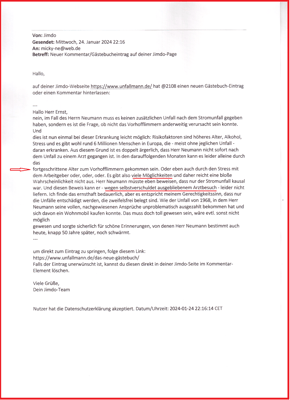 Es liegt der Ansatzpunkt vor und ist von Telare mit seinem Eintrag in meinem Gästebuch vom 24.01.2024 22:16 unter #2117 dokumentiert. Nun könnten sich 6 Millionen Menschen in Europa bei Telare bedanken die unter chronischem VHF leiden. Denn eine Unfallrente wird möglich, wenn sie glaubhaft machen können bis zum Unfalltag war ihr Herz frei von VHF.