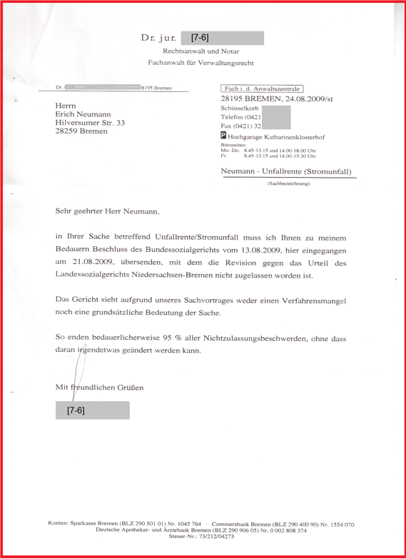 Es folgt der Schriftsatz an das BSG Kassel, wegen Gewährung einer Unfallrente bzw. Stützrente wegen Stromunfalls wird die Nichtzulassungsbeschwerde wie folgt begründet: