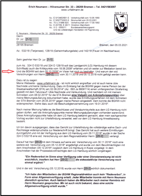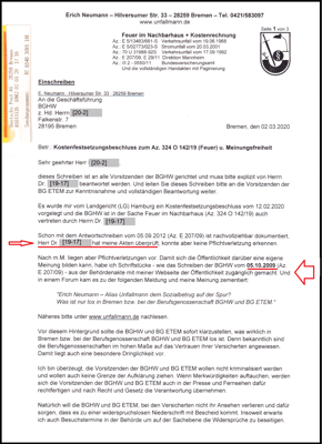 Dieses Schreiben vom 05.10.2009* (drei Seiten) hat die Staatsanwaltschaft (STA) Bremen am 22.11.2012 sofort zu einem Ermittlungsverfahren mit dem Tatvorwurf üble Nachrede veranlasst. Jedoch hat die STA Bremen die BGHW zu keiner sofortigen Vernehmung vorgeladen. So ist es mit dem Schreiben der BGHW vom 22.05.2013 nachvollziehbar dokumentiert.