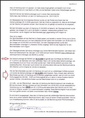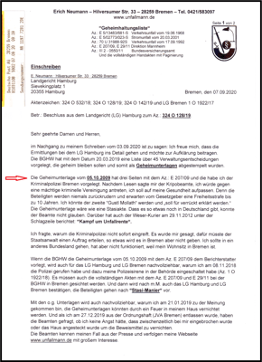 Die Kriminalpolizei Bremen hat das Schreiben vom 05.10.2009* (drei Seiten) ebenfalls aktenkundig gesichtet. Und mit dem Hinweis auf den Fall von "Gustl Mollath" wurden mir dazu Anweisungen erteilt wie ich mich zu verhalten habe.