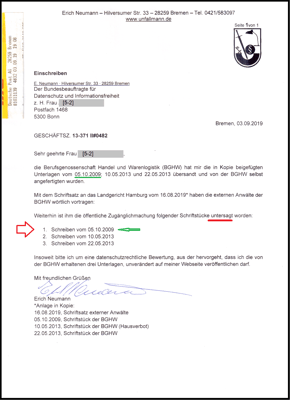 Die "Stasiakte" der BGHW vom 05.10.2009 (drei Seiten) hat die BGHW dem Bundesbeauftragten für den Datenschutz und die Informationsfreiheit vorgelegt und wird mit dem Antwortschreiben der BGHW vom 21.10.2019 nachvollziehbar.