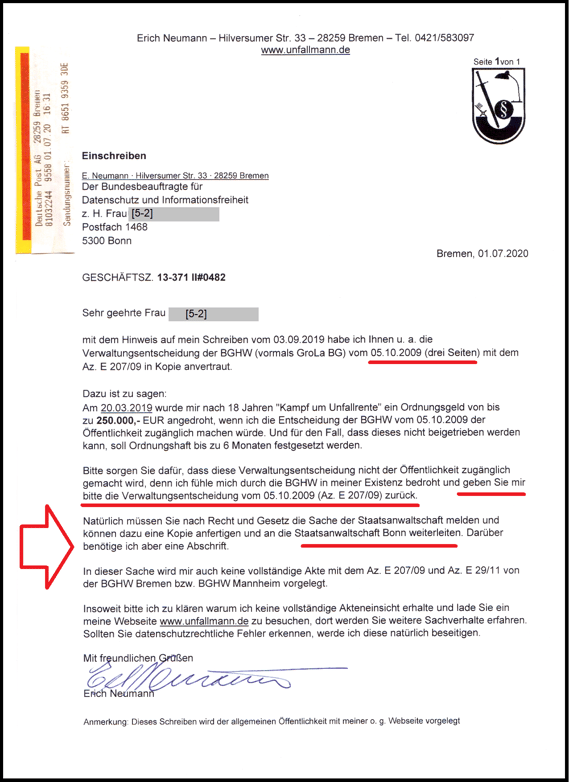 Angeblich ist das Schreiben vom 05.10.2009* (drei Seiten) seit dem Schriftsatz der Beklagten (BGHW) vom 20.12.2019 in der Behördenakte der BGHW nicht mehr auffindbar, mir liegt aber ein Kopie greifbar vor.