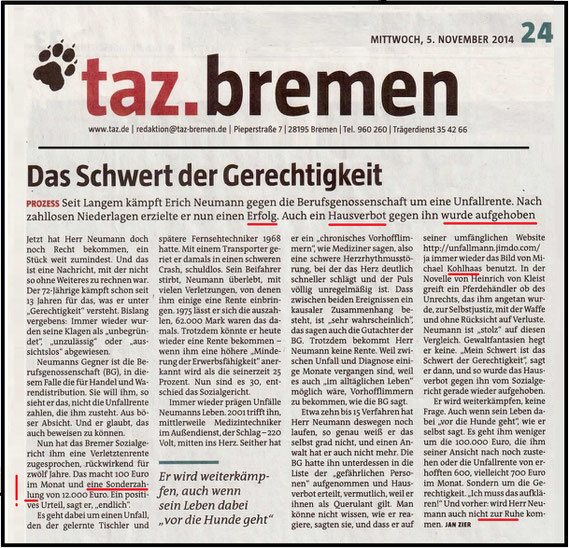 Dazu sollen Sie wissen, ich bin kein Einzelfall. Und am 25.10.2012 wurde ich von der BGHW in vier Schriftsätzen vor dem SG Bremen zu Unrecht als "Amokläufer" abgestempelt und habe Hausverbote erhalten.