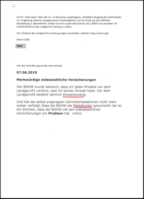 Ein Bankdirektor a.D. - in meinem Gästebuch Mazi - hat 1000,-€ an das Landgericht (LG) Hamburg überwiesen damit ich nicht ins Gefängnis komme. Denn er kann es nicht ertragen, dass ein Deutscher von seiner Meinungsfreiheit gebrauch macht und dafür ins Gefängnis soll, so etwas gab es schon vor 80 Jahren. Dazu im Einklang gibt es die E-Mail v. 06.11.2019.