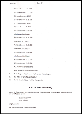 Dazu im Einklang wurde mir aus dem Landgericht (LG) Hamburg mit dem Versäumnisurteil vom 13.08.2019 ohne mündliche Verhandlung eine Liste über 45 Akten und Verwaltungsentscheidungen zur Geheimhaltung vor der Öffentlichkeit vorgelegt. Wenn ich dem Urteil nicht folge, werde ich von einem Ordnungsgeld bis 250.000 Euro bedroht und Ersatzweise werde ich von einer Ordnungshaft bis zu zwei Jahre bedroht.