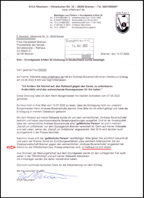 Rufmord wird auf meiner Webseite auf keinem Fall geduldet. Nun sollte Herr Bürgermeister Andreas Bovenschulte bekannt geben, ob er den Gästebuch-Eintrag am 03.06.2022 hinterlassen hat. Und wo er Rufmord auf meiner Webseite gesichtet haben will.