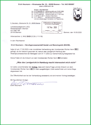 Wo dieses Geheimdokument vom 05.10.2009 (drei Seiten) geblieben ist muss geklärt werden. Denn ich werde von einem Ordnungsgeld bis 250.000,-€ bedroht oder bis zu zwei Jahren Gefängnis, wenn das Geheimdokument an die Öffentlichkeit kommt. Und das Kopieren ist auch untersagt. Dieses Geheimdokument löst bei mir psychosomatische Belastungsstörungen aus. Und ist kein Hilferuf aus dem Viertel sondern mein "Hilferuf" an den Bürgermeister und seinem Senat.