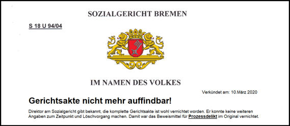 Seit dem 10.03.2020 ist bekannt, die Gerichtsakte ist nicht mehr auffindbar. Es ist nun zu klären, welche Verfügung der Direktor am Sozialgericht, zum Auffinden der Akte erlassen hat und in Prozessdelikt verwickelt ist. Wie die Urteile vom 18.12.2008 am Landessozialgericht Bremen zum Az.: L 14 U 183/05 und L 14 U 199/06 mit seiner Unterschrift dokumentieren.