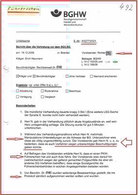 habe ich mit meinem Anwalt das gesetzwidrige Verhalten der BGHW für das LSG Bremen dokumentiert. Das LSG hat keine Stellungnahme zur weiteren Aufklärung von der Beklagten verlangt. Die gesetzwidrigen Handlungen der Beklagten sind also mit meinem Schreiben vom 10.06.2008 für das LSG glaubhaft geworden. Und die Beklagte hat mit keiner Stellungnahme widersprochen.