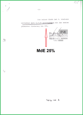 Hier wird die Teil-Minderung der Erwerbsfähigkeit (MdE) von 25 % beziffert. Mit dem deutlichen Hinweis: