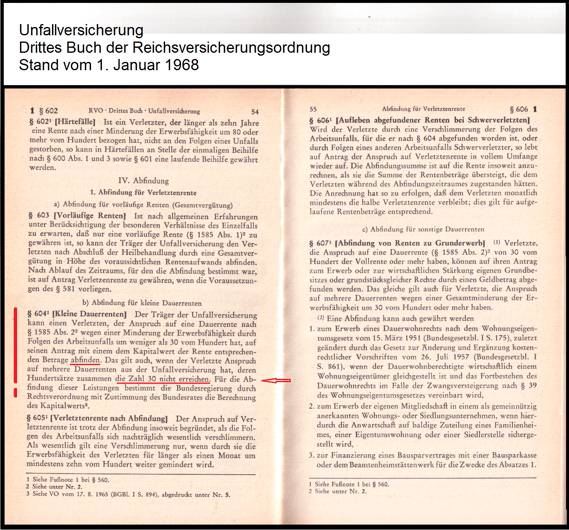 Ferner wurden die mit Bescheid anerkannten Unfallfolgen nicht beziffert, somit gab es keiner MdE von mehr als 25%. Es wäre nämlich zu einer Gesamt-MdE von nicht unter 30% gekommen und die Abfindung auf Lebenszeit hat der Gesetzgeber nicht erlaubt vgl. § 604 RVO.