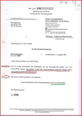 Schreiben von meinem Anwalt Dr. jur. dokumentiert, wir überprüften die Behörden u. Gerichtsakte und haben Prozessdelikt erkannt. Und ist mit dem Schreiben aus dem SG Bremen vom 01.09.2009 und 07.09.2009 bestätigt.