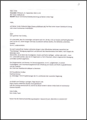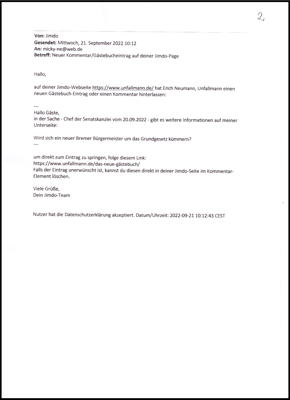Danach(!) hat am 20.09.2022 um 21:07 Thomas Ehmke - Chef der Senatskanzlei Bremen in meinem Gästebuch den folgenden Eintrag gemacht: