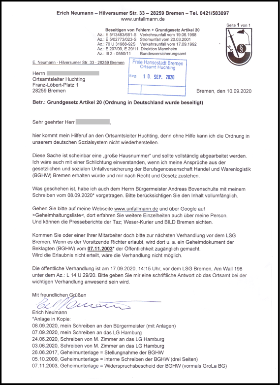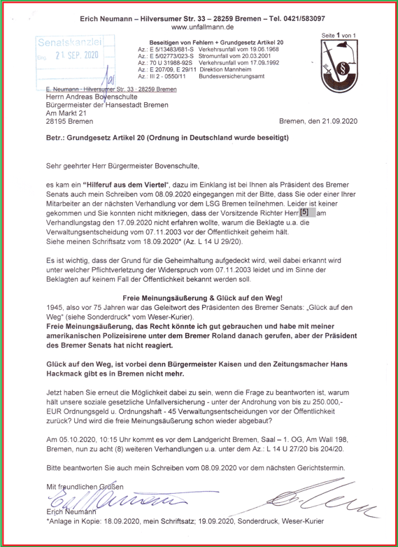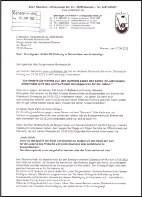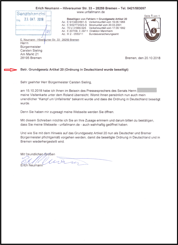 hat das folgende Schreiben gesichtet und unterzeichnet. Aber von meinem Grundgesetz kann ich weiterhin kein Gebrauch machen. Denn ich wurde am 13.08.2019 gegen meinem Willen zum "Geheimnisträger" gemacht. Dem Bürgermeister liegt die Geheimakte vom 05.10.2009 zum Az. E 207/09 vor und von der Kriminalpolizei Bremen als "Stasiakte" bewertet wurde. Die Wertung habe ich übernommen und ist keine üble Nachrede.