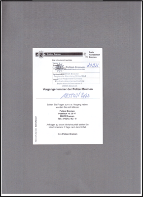 Am Nachmittag den 20.09.2022 habe ich bei der Polizei Bremen (Hauptbahnhof) eine erneute Anzeige wegen Betrug etc. gestellt.