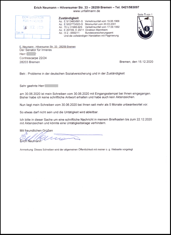 Nun wurde der Eingang meiner Schreiben bestätigt und an den Senator für Inneres weitergeleitet wurden. Darüber wurde ich aber nicht informiert. Auch von dem Senator für Inneres habe ich darüber keine Information erhalten. So ist bis dato auch unbekannt, ob die Geheimakte vom 05.10.2009 den Senator für Inneres erreicht hat und wie die Senator damit umgeht.