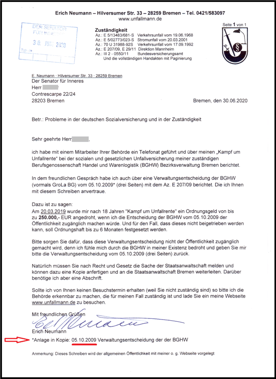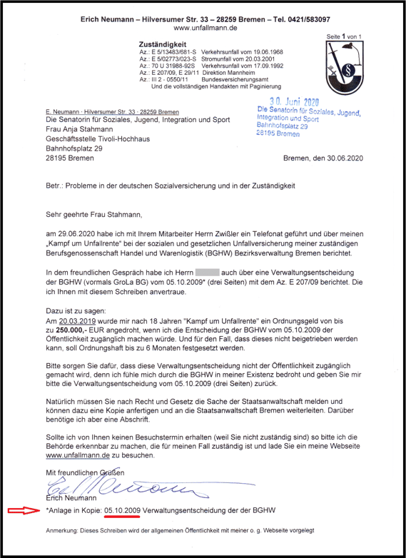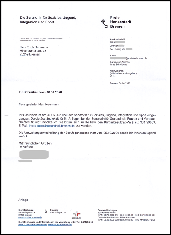 Mit dem Antwortschreiben vom 30.06.2020 habe ich sofort die Geheimakte vom 05.10.2009 (drei Seiten) von der Senatorin für Soziales zurückbekommen. Mit dem Hinweis: