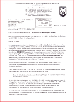 Kommt es nun aus dem LSG Bremen zu der Entscheidung, dass die Beklagte keinen Gesundheitsschaden als Tatbestandsmerkmal des Arbeitsunfalls in ihrem Bescheid vom 27.04.2004 einzutragen hat (vgl. § 8 SGB VII). Dann werde ich erneut gedrängt, der Generalstaatsanwaltschaft Bremen zu melden, dass die aktenführende Behörde (BGHW) keine für mich nachteiligen Schriftstücke aus der Akte entfernt und durch merkwürdige Urteile aus dem SG/LSG Bremen dabei unterstützt wird vgl. 17.11.2009.