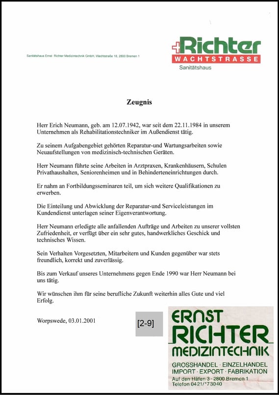 Zeugnis und die Zeit der Beschäftigung in der Medizintechnik