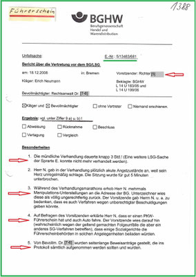 "Dass es zu einem Eklat zwischen dem Vorsitzenden und dem Kläger kam, an dessen Ende der Vorsitzende erklärte, es gäbe nicht nur den Tatbestand der Unterdrückung von Unterlagen, sondern auch - zum Kläger gerichtet - den Tatbestand der bewussten falschen Anschuldigung."