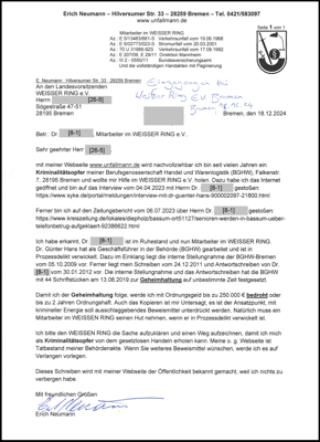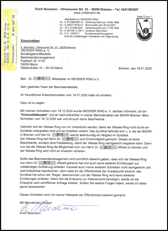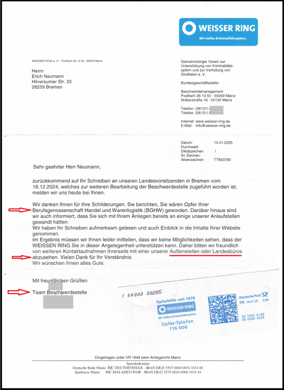 Wegen Datenschutz, habe ich die Namen auf meiner Webseite durch Nummern ersetzt. Einige Fotos hat der Vorsitzende (1. Foto) der BGHW für die Öffentlichkeit freigegeben. Sein Name ist auf den Fotos unten links dokumentiert. Der Vorsitzende und die abgelichteten Personen sind in meinem Fall verwickelt und international am Wirken. Das 4. Foto lichtet den Täter und Geschäftsführer der BGHW ab, der nun im Ruhestand, beim WEISSER RING zum Ehrenmitglied geworden ist. Über seine Person wurde am 04.04.2023 und in der Zeitung am 06.07.2023 berichtet. Diese Person hat mich zum "Kriminalitätsopfer gemacht. Mit meinem Schreiben vom 18.12.2024 habe ich beim WESSER RING angefragt, wie der Verein damit umgeht. Mit dem Antwortschreiben vom 14.01.2025 ist dokumentiert, der Verein sieht - wie der Polizeipräsident von Bremen - keine Möglichkeiten mir zu helfen.