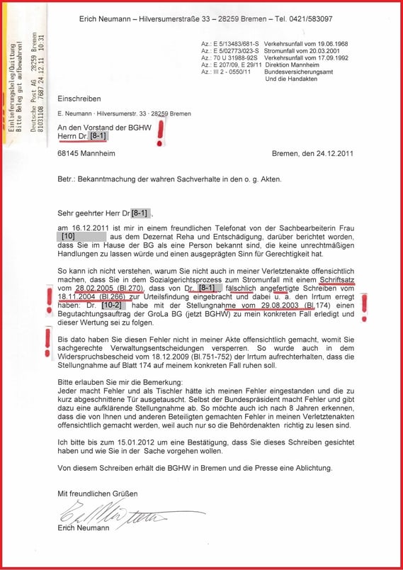 Aktenkundig werde ich von der BGHW bedroht und muss 45 Akten und Verwaltungsentscheidungen der BGHW geheimhalten. Die u.a. Betrugsmaschen von Dr. jur. [8-1] dokumentieren.