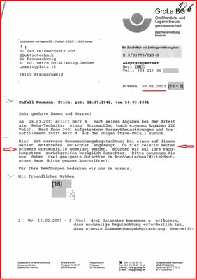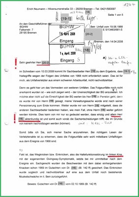 Ferner muss ein Mediziner den Schaden an der Unterseite meiner li. Kniescheibe aus dem Arbeitsunfall vom 19.06.1968 bewerten. Und auch die Muskelschwäche im li. Bein und li. Arm/Hand. Ferner ist die von den Medizinern diagnostizierte Kopfschädigung im Bescheid einzutragen.