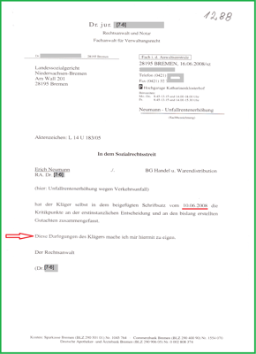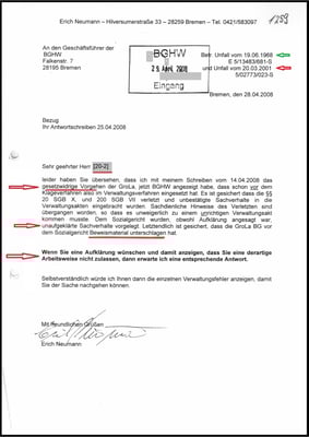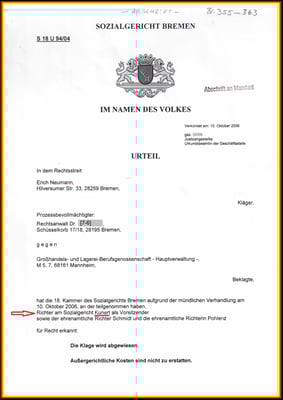 Als die BG ETEM der BGHW (vormals Gro La BG) die Amtshilfe durch einen Mediziner angeboten hat (19.06.2007), da hat die BGHW (25.06.2007) und das LSG Bremen (25.06.2007) davon keinen gebrauch gemacht. Es ist der Ansatzpunkt, meine Klage soll abgelehnt werden und der Richter will von der Wahrheit nichts wissen.