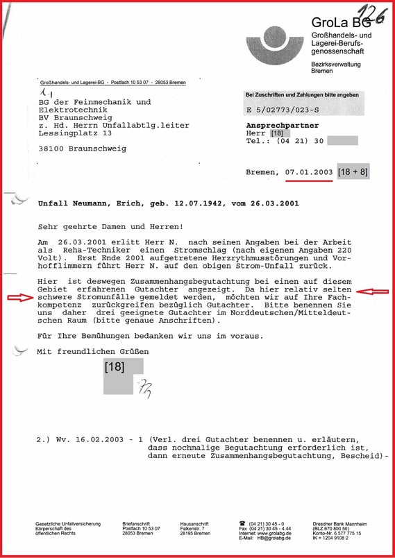 BGHW kennt sich angeblich mit Stromunfällen nicht aus und hat mit Schreiben vom 07.01.2003 vorgetragen, die BGHW möchte auf die Fachkompetenz der BG ETEM (vormals BG FE) zurückgreifen.