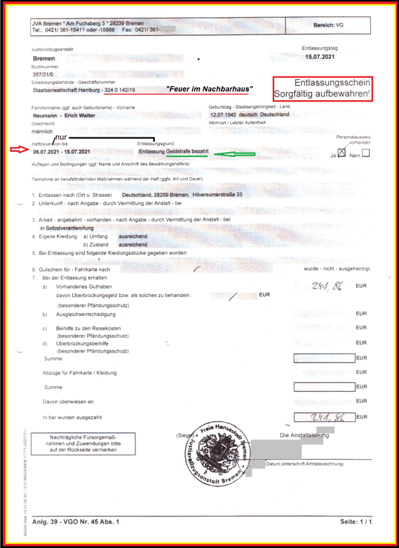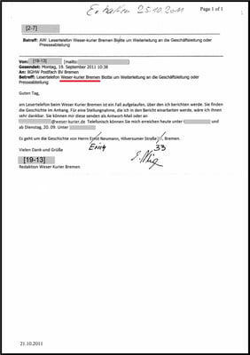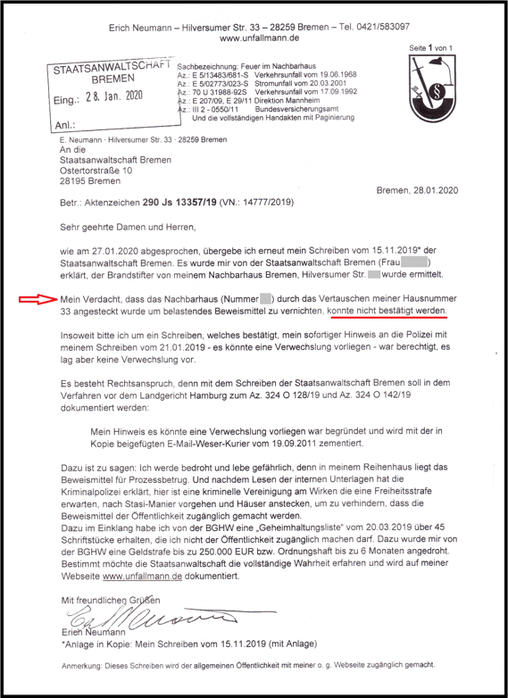 Ich habe von der Meinungsfreiheit gebrauch gemacht und darauf hingewiesen, 6000 Blatt Beweismittel und Geheimunterlagen der BGHW hätten durch ein Feuer wie in meinem Nachbarhaus am 21.01.2019 im Sinne der BGHW vernichtet werden können. Konnte aber nicht geschehen, weil der Weser-Kurier mit der E-Mail vom 19.09.2011 der BGHW eine falsche Hausnummer übermittelt hat.
