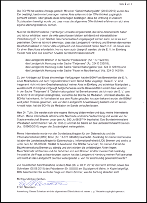 Es folgt der Bescheid vom 17.11.2009 aus der Generalstaatsanwalt Bremen aus dem geht hervor, dass ich gegen die Mitarbeiter der BGHW ein Ermittlungsverfahren angstregt habe. Und 44 Pflichtverletzungen durchgängig erkannt wurden. Insoweit auch die aktenführende Behörde die für mich nachteiligen Schriftstücke zu entfernen hat. Aber dazu lässt es die aktenführende BV Bremen nicht kommen.