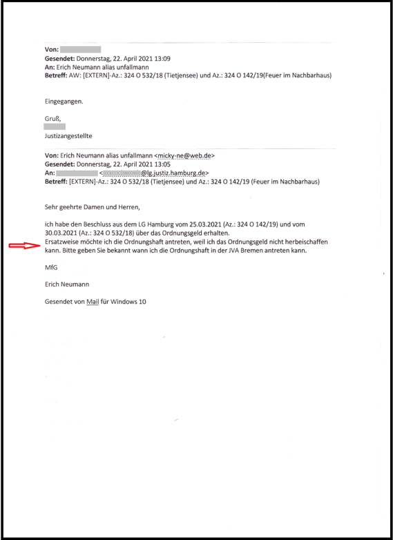 Meine E-Mail dokumentiert warum ich die Ordnungshaft antreten werde.