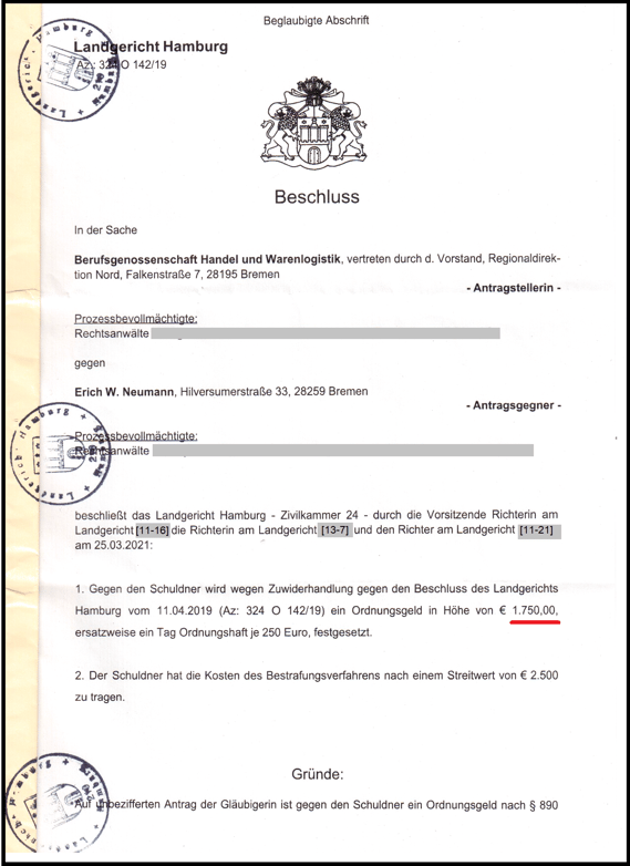 Festgesetztes Ordnungsgeld: 1750,00 €, ersatzweise ein Tag Ordnungshaft je 250 Euro.