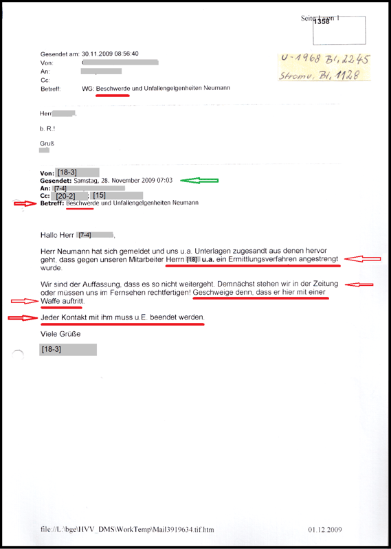 Es folgt die E-Mail vom 17.11.2009 der BV Bremen und melden der HV Mannheim, dass die BGHW erfahren hat, ein Ermittlungsverfahren wurde gegen die Mitarbeiter der BGHW angestrengt, so darf es nicht weitergehen und die Maßnahmen wurden festgesetzt.
