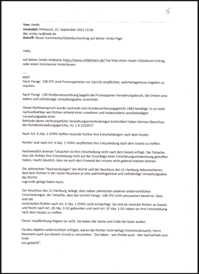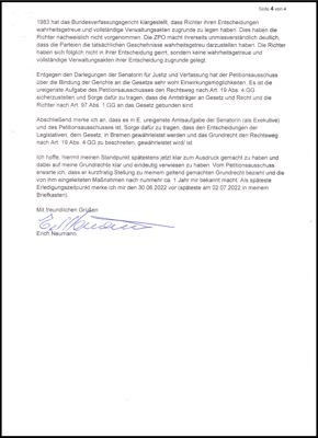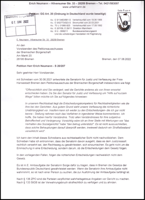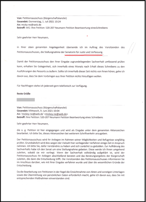 Mit der E-Mail erhalte ich vom Petitionsausschuss als Anlage die Stellungnahme der Senatorin f. Justiz u. Verfassung vom 30.06.2021.