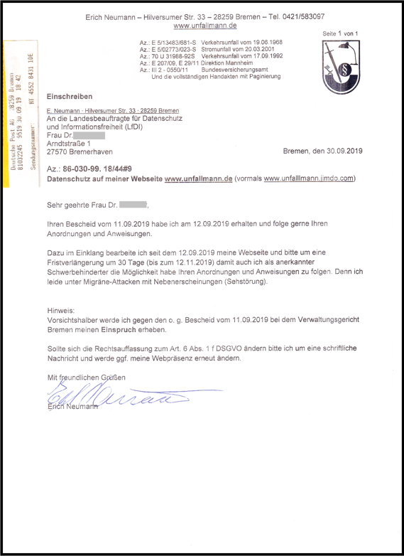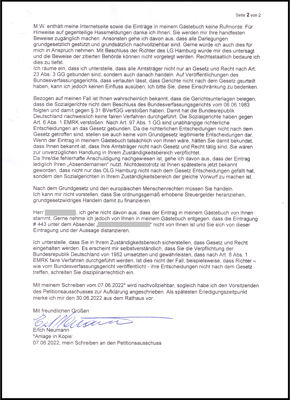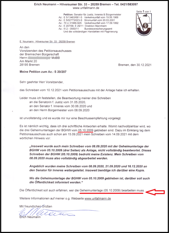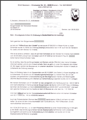 hat das folgende Schreiben gesichtet und unterzeichnet. Aber von meinem Grundgesetz kann ich weiterhin kein Gebrauch machen. Denn ich wurde am 13.08.2019 gegen meinem Willen zum "Geheimnisträger" gemacht. Dem Bürgermeister liegt die Geheimakte vom 05.10.2009 zum Az. E 207/09 vor und von der Kriminalpolizei Bremen als "Stasiakte" bewertet wurde. Die Wertung habe ich übernommen und ist keine üble Nachrede.