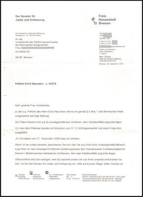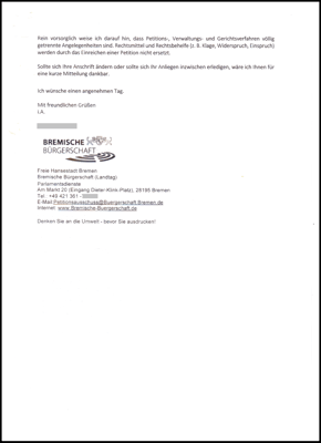 Aus der Senatskanzlei (Bürgermeister) kommt eine Antwort an den Petitionsausschuss Bremen.