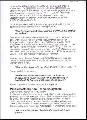 Dieses ist meine Meinung (m. M.) und meine Anschuldigung ist begründet. Insoweit liegen auch die Anknüpfungspunkte vor. Dazu im Einklang kam es schon am 02.09.2014 zu einer Strafanzeige gegen meine Person, mit dem Tatvorwurf, üble Nachrede und Verleumdung.