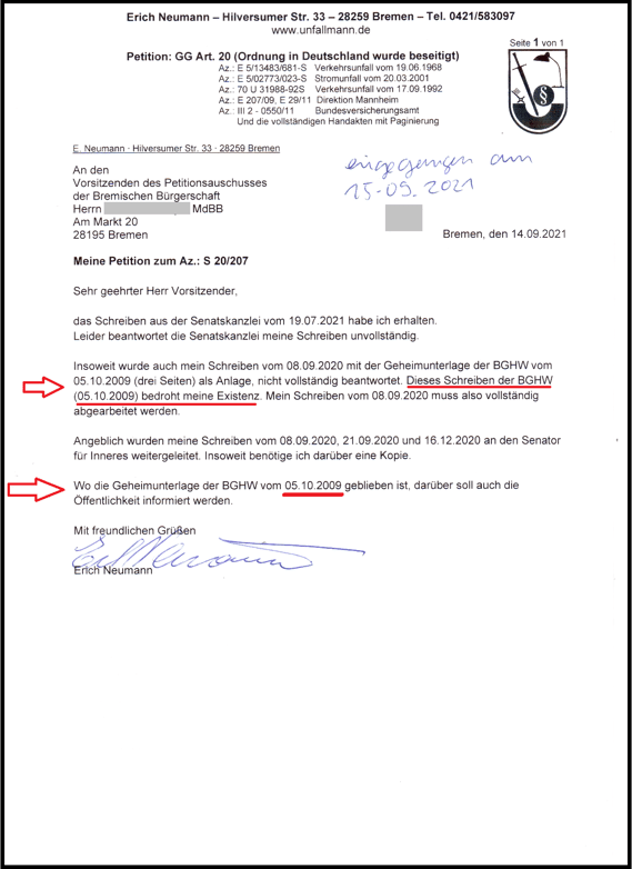 Mit dem Antwortschreiben vom 30.06.2020 habe ich sofort die Geheimakte vom 05.10.2009 (drei Seiten) von der Senatorin für Soziales zurückbekommen. Mit dem Hinweis: